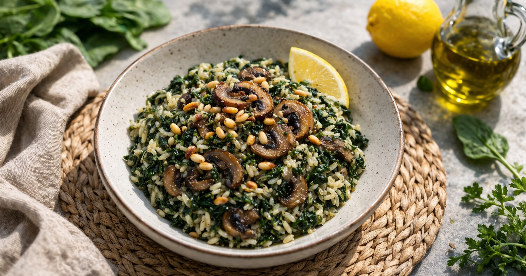 Με ένα απλό υλικό που κάνει όλη τη διαφορά – τα μανιτάρια – το σπανακόρυζο μεταμορφώνεται σε ένα πιάτο πεντανόστιμο, χορταστικό και ιδανικό για κάθε μέρα.