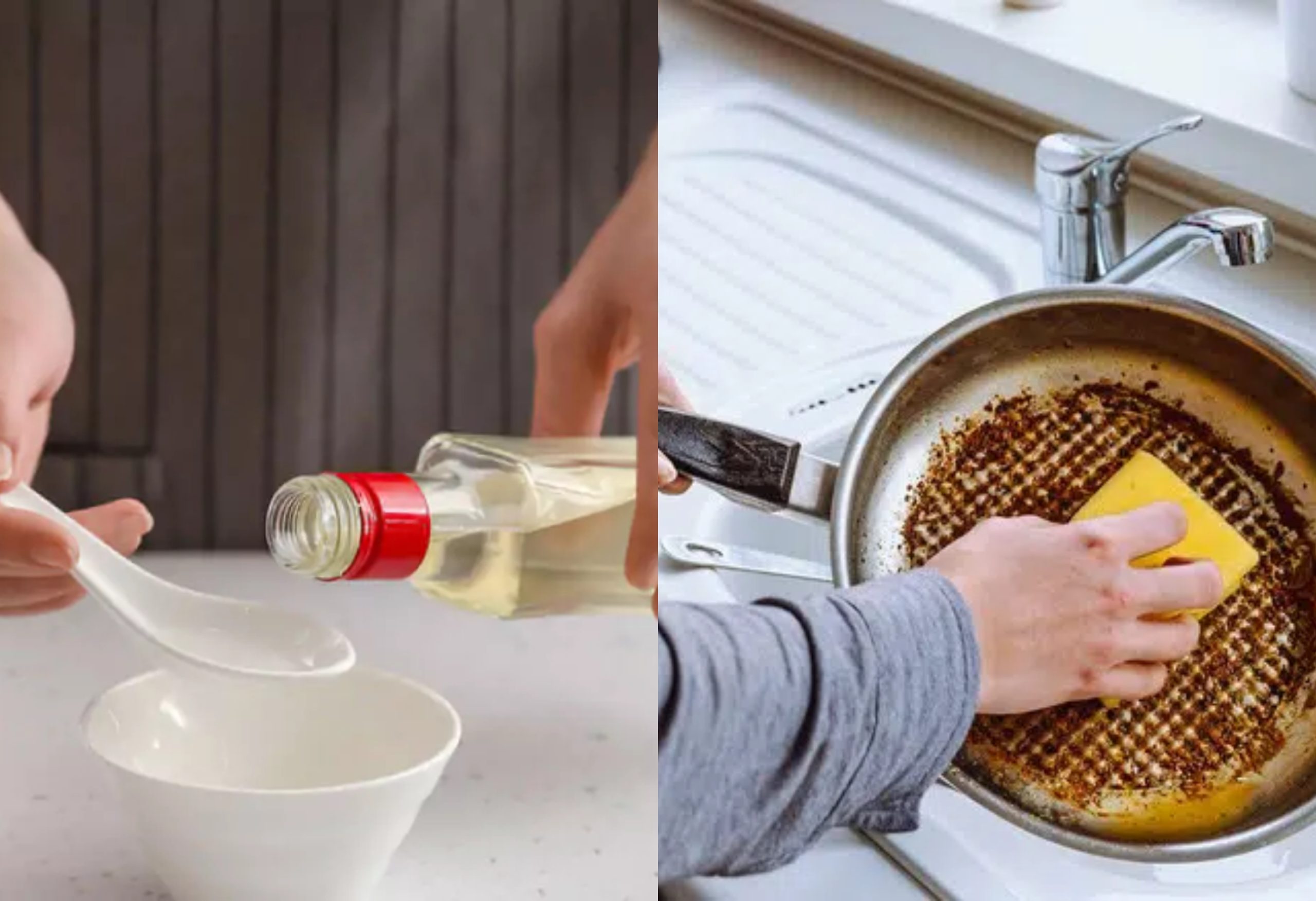 Αναμίξτε 1 κουταλιά λευκό ξίδι με 1 κουταλιά ζάχαρη και τρίψτε ελαφρά κατσαρόλες ή τηγάνια με λεκέδες από καμένο φαγητό. Η ζάχαρη λειτουργεί ως φυσικό αποξεστικό και το ξίδι μαλακώνει τα υπολείμματα.